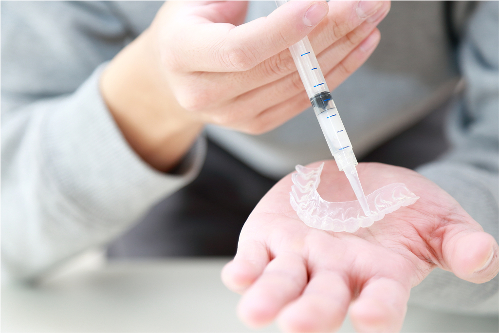 型取りの上で、オーダーメイドのマウスピースを製作します。ご自宅でマウスピースに薬剤を流し込み、決められた時間装着していただきます。繰り返すことで徐々に歯が白くなっていきます。